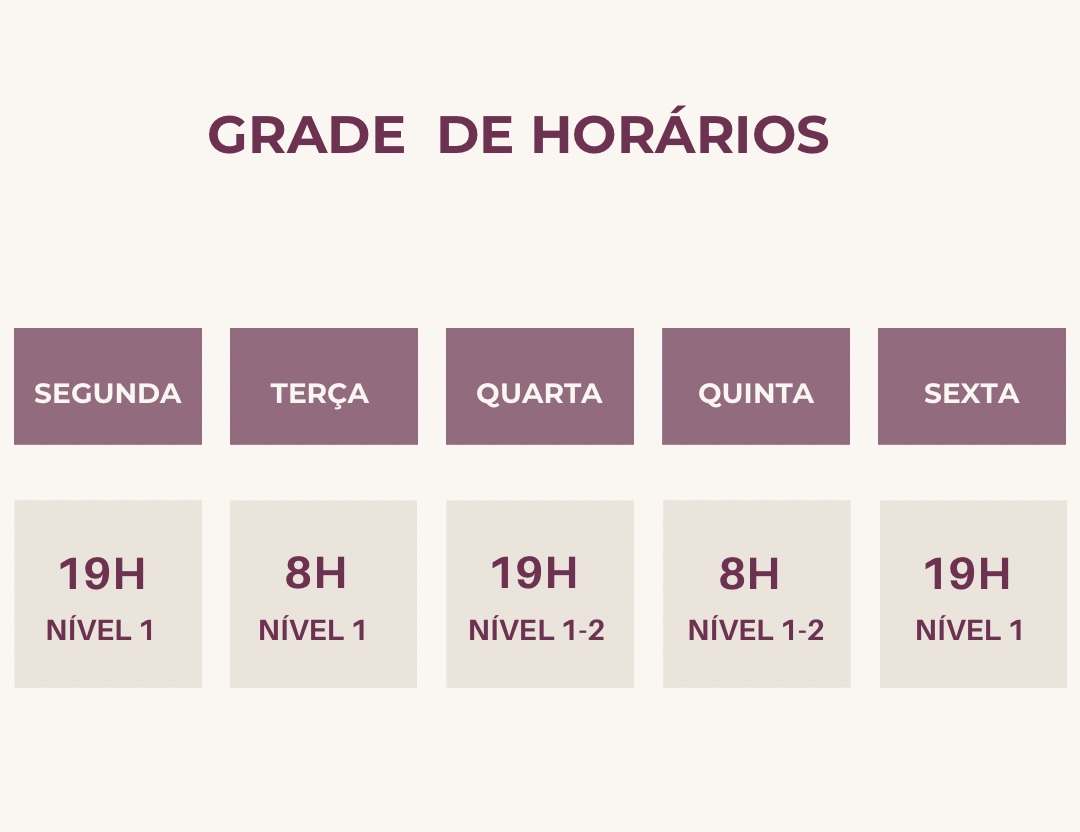 As aulas são organizadas por níveis, oferecendo um percurso progressivo desde o início até o aprofundamento da prática.